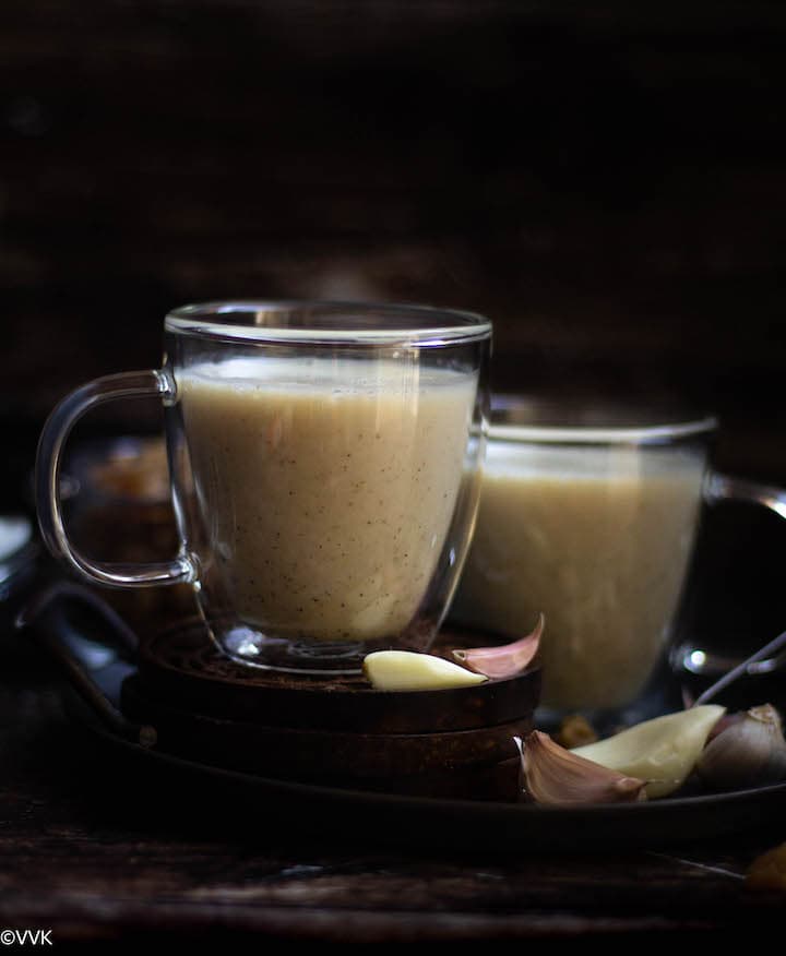 You can thin it down by adding more milk so each serving can be 200 to 240ml. You can also reduce the milk and make it like a gruel/thick porridge or koozh, as we say in Tamil. In that case, each serving will be 2 tbsp. We usually take this garlic milk weekly once.