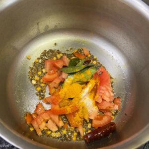 Let the mustard seeds splutter, and then add the tomatoes, curry leaves, turmeric powder, and salt. Saute for two to three minutes or until the tomatoes are slightly soft.