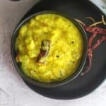 Pressure cook the moong dal by adding double the water measure and ⅛ tsp of turmeric powder for three whistles. Let the pressure drop and mash the dal.