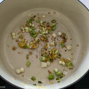 Heat a wide pan or Dutch oven and add the oil. When the oil is hot, add green onions, garlic, and ginger. Saute over medium heat until the garlic turns deep golden brown.