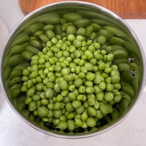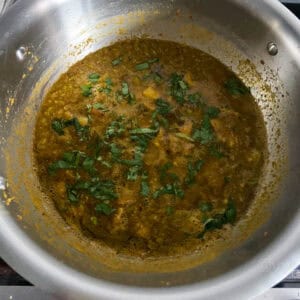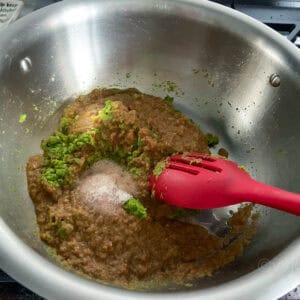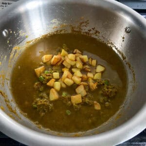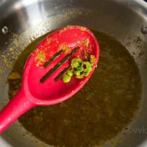 Let this gravy simmer for about 8 to 10 minutes over low heat. By now, the peas should be soft and mushy. If your peas are hard, cook for a few more minutes. Taste the nimona and adjust the salt and spices. If your peas are not sweet, add the jaggery at this stage.