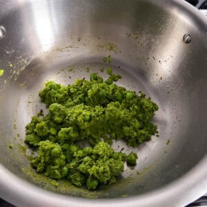Now add the ground peas along with the whole ones. Reduce the heat to medium-low.