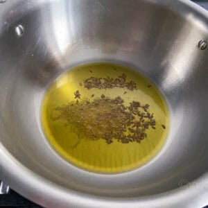 In the same pan in which you fried the potatoes, add the cumin seeds and the asafoetida and let the cumin seeds sizzle.