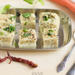Then garnish it cilantro and chop the Dhokla into small squares or your favorite shapes and serve it with green chutney and sweet chutney.