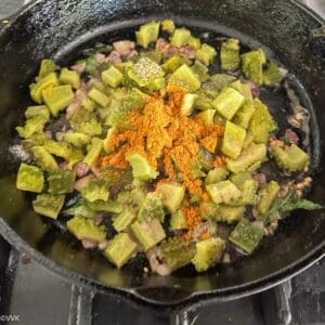 Add the cooked bitter gourd, salt, and sambar or chili powder, mixing well.