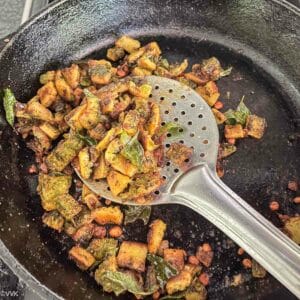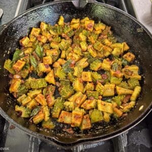 Here is a simple South-Indian crispy bitter gourd stir-fry recipe that's a perfect side dish for rice-based dishes! Check out how to make this simple pavakkai fry in a cast-iron pan with detailed step-wise pictures.