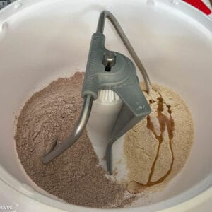 I prepared my dough in the Nutril mill artiste. You can prepare it with any stand mixer or knead it by hand also. In a mixing bowl, add the whole wheat flour, ragi flour, oil, and salt.