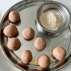 I like to use an equal measure of ragi and wheat flour. You can adjust it as per your liking. But if you increase the measure of ragi flour, rolling will be slightly difficult.