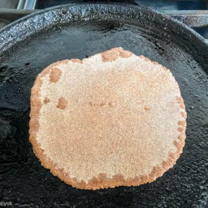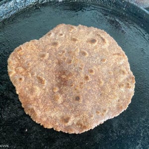 Now flip the roti and cook until you see the brown spots like below. Gently press the roti as you cook so that the oil spreads evenly and the roti puffs up slightly. I did not let the roti puff up fully like phulka.