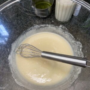 Add ⅓ portion of the dry ingredients and mix well. Now add half the amount of almond milk-vinegar mixture and gently mix.