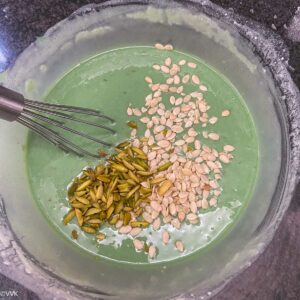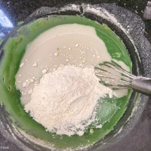 Add ⅓ of the dry ingredients, paan juice, paan essence, green food color, and gulkand.
