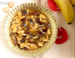 For this recipe I am using fresh banana and half an apple and for dry fruits I went with raisins, dried figs and dates of course. I had powdered jaggery at home and also cane/brown sugar. So used both for this recipe but you can always use either one. This is a super sweet prasadam as you can see we are using sweet fruits added with honey, jaggery and sugar candy. For additional flavor you can use cardamom powder but that’s completely optional. I went with ¼ tsp of cardamom powder.