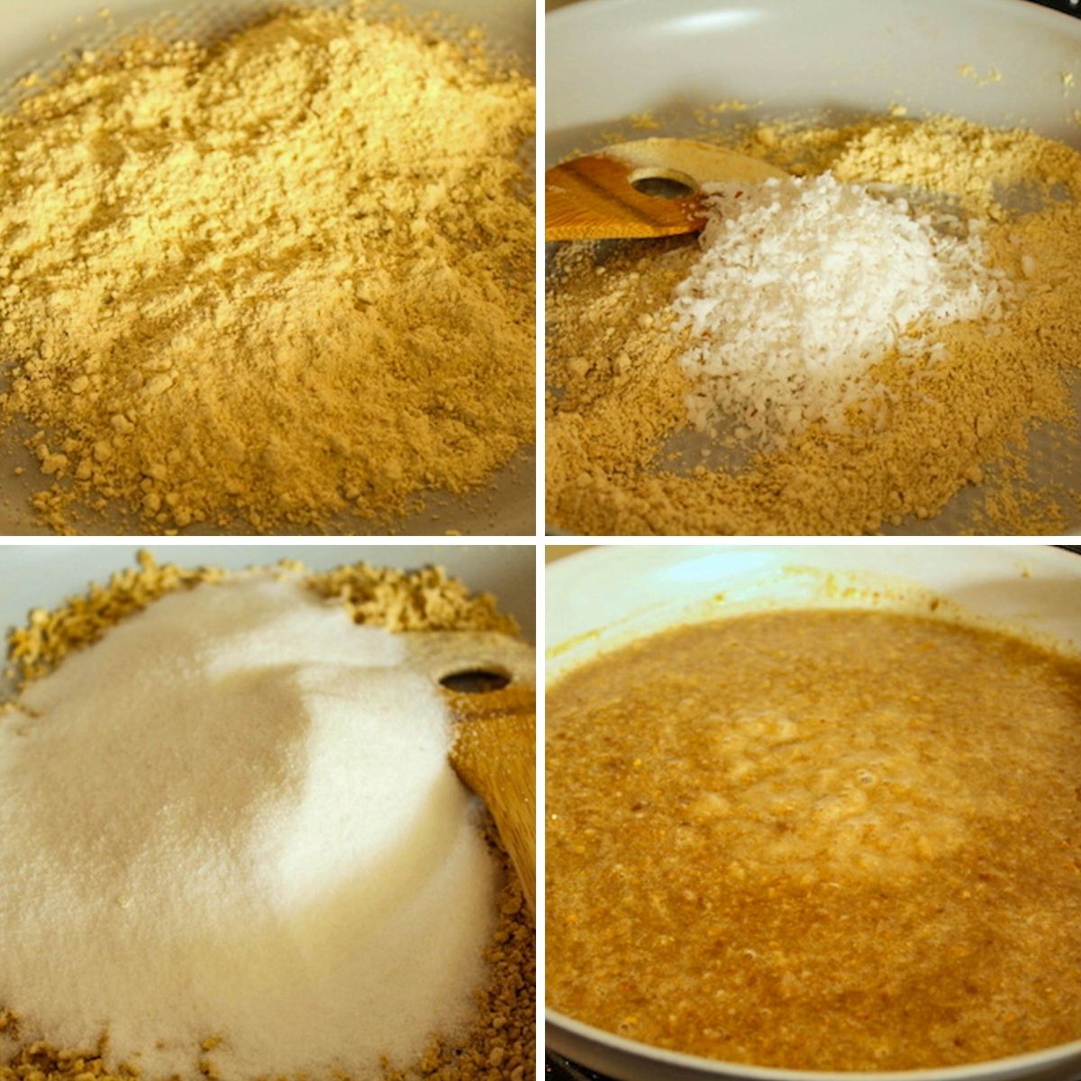 - Right after adding besan, be ready to mix the besan. As the pan is hot, the besan might get burnt.