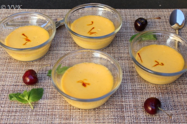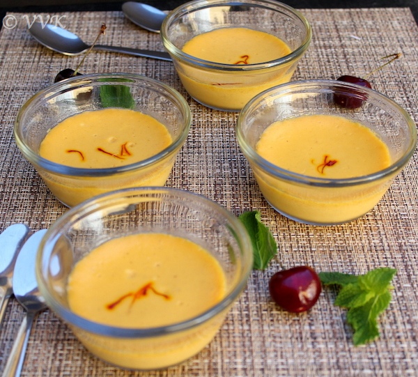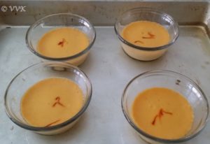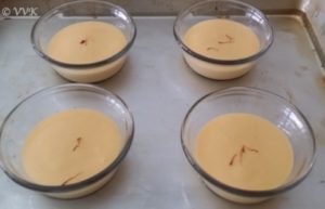 - Pour this mixture equally in the ramekins and add couple of saffron strands on top.