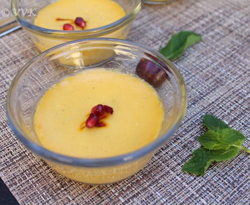 I pretty much followed Pavani’s recipe except for a couple of things. I included Elaichi powder and also used sugar and condensed milk combo. And I decorated with pomegranate instead of chopped nuts. As I had some leftover canned Alphonso mango puree, I used that.