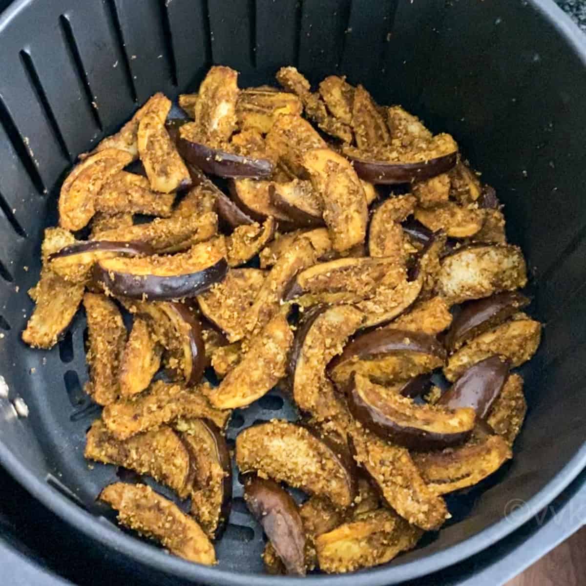 - Add the brinjal into the air fryer basket and air fry at 370 deg F for 8 minutes.