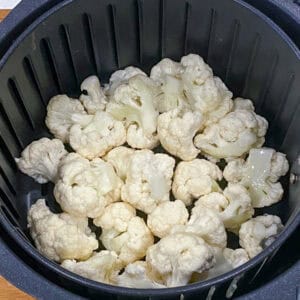 - Place the cauliflower florets in the air fryer basket. Spread them evenly. I did not work in batches this time, as I had only a few florets extra. I just placed it on the top and sides.
