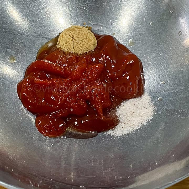 Ketchup: The sweet and sour flavor comes from this. You can use 3 to 4 tbsps. I used 3 tbsps for this measure. You can reduce it further if you are conscious of the sodium and sugar content in it.