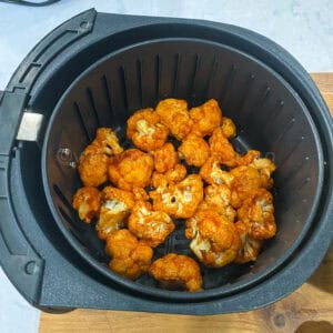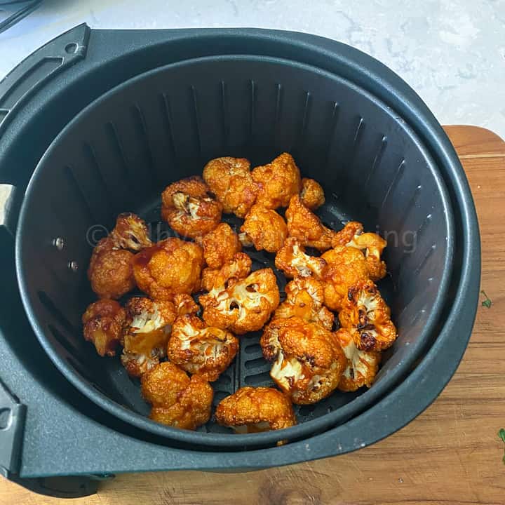 - Now add the cauliflower to the air fryer basket of your air fryer, cook at 370 deg F for 16 minutes, tossing them once in between around 8 minutes.