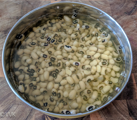 - Cook the soaked black-eyed peas by adding turmeric powder, two drops of gingelly oil and 2 cups of water in your preferred way. I cooked on my instant pot for 8 minutes on high pressure, manual mode and let the pressure release naturally.