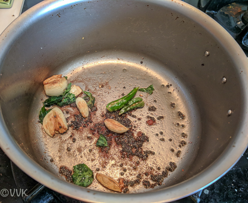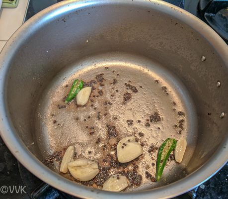 - Then add the mustard seeds, hing, curry leaves, green chilies, and the crushed garlic.