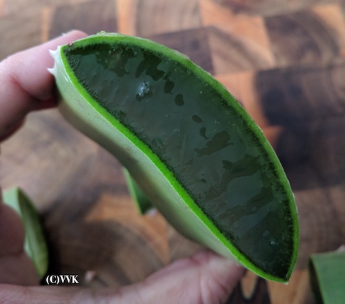 - Cut the aloe vera and extract the gel part alone. I am still learning to chop it correctly. I had to chop in multiple steps to extract the gel. Make sure you are only using the middle portion.
