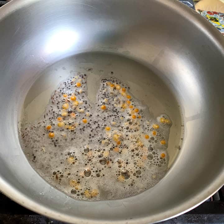- Heat a pan and add the ghee. Once it melts, add the mustard seeds, cumin seeds, urad dal, and channa dal.