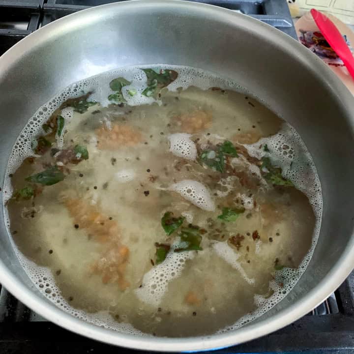 - If you notice, we did not add asafoetida or onion. You can add both. Along with curry leaves, you can add little hing as well. If using onion, 1 cup of chopped onion would be good for this measure. Saute the onion and then add the water.