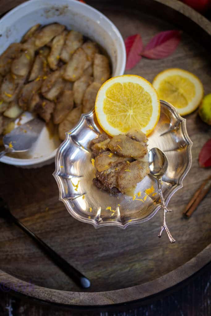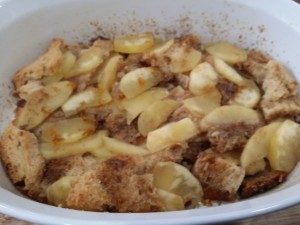 Even though this recipe involves baking, there is no mixing, no accurate measuring, etc. All you need to do is chop the bread and apples, prepare the syrup, layer them all, and bake.