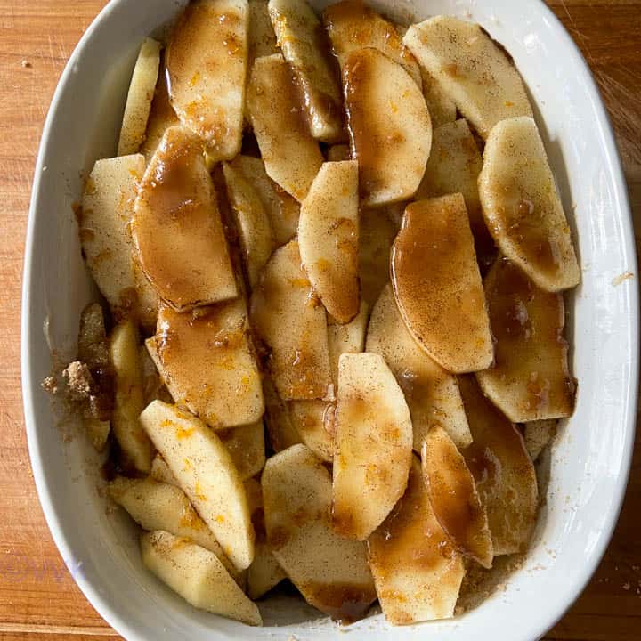 Traditionally granny smith apple varieties are used in this brown betty, but I used our all-time favorite honey crisp. I have tried this recipe with fuji and gala apples as well.
