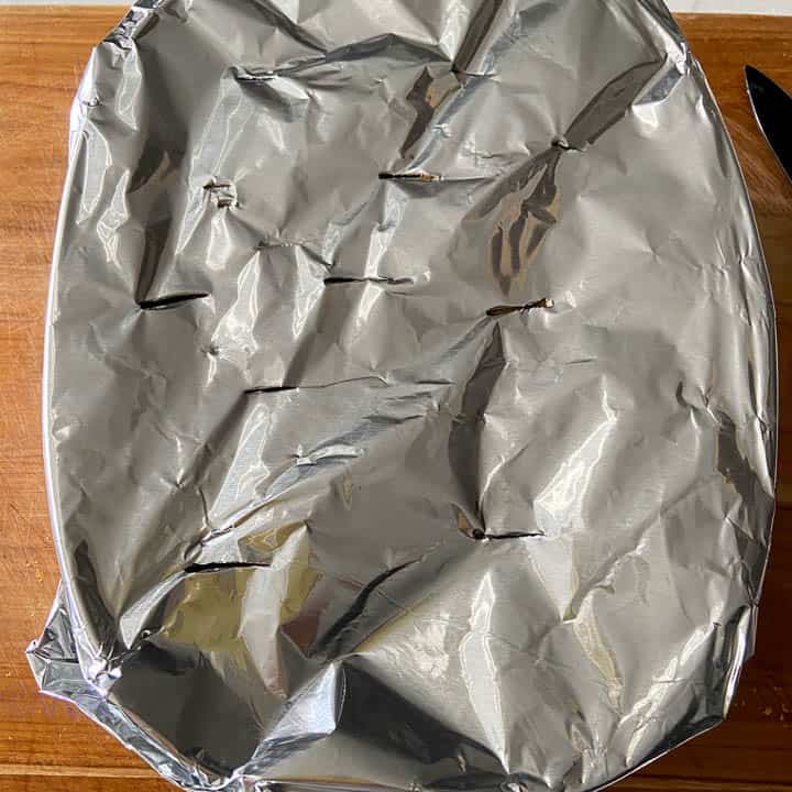 - Cover the baking dish with aluminum foil, and using a fork, poke a few holes like below.