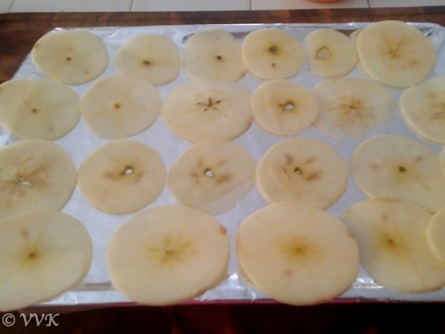 Luckily apples are available here all the year around. I used honey crisp apples for this recipe and I peeled the skin off unless you are sure that there are no wax coats. The other key thing with this recipe is the baking time. It completely depends on how thin your apple slices are.