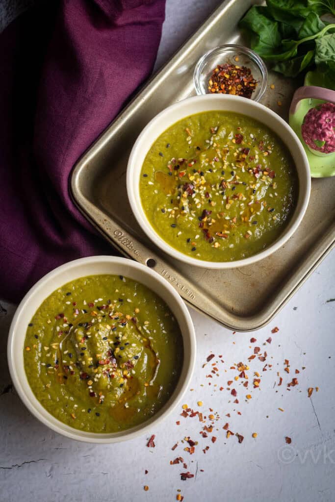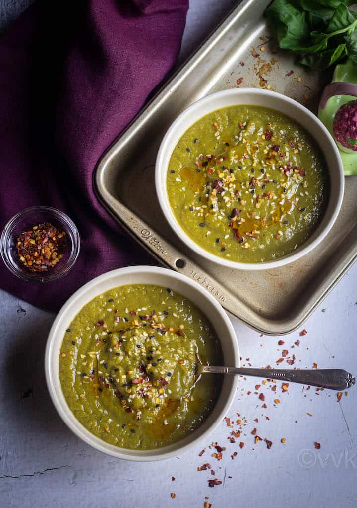 Anytime is a good time for a comforting bowl of soup. How about making some rich and creamy, nutrient-rich green soup, loaded with the spring veggies – fresh asparagus, green peas, broccoli, and amazing flavors of basil? Sounds interesting? this recipe is all about that.