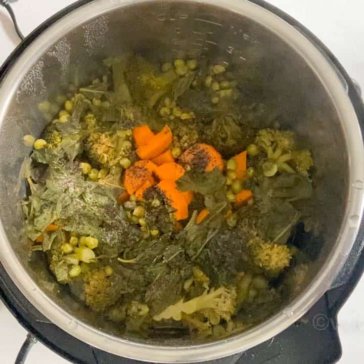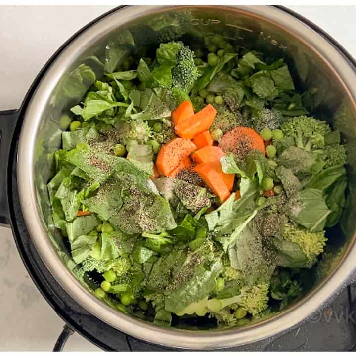 - Add 1 cup of the water to the inner pot of the Instant Pot. Then add the asparagus, followed by broccoli, sweet potatoes, green peas, and basil. Now add the remaining one cup of water, salt, and ground pepper.