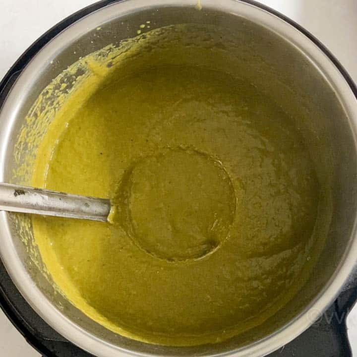 - After pureeing, set the Instant Pot in saute mode. Check for the seasonings and if required, add salt. If using chili flakes, add it now and let it simmer for a couple of minutes. (The soup will splash. So be cautious and turn off right away) And that’s it. The creamy asparagus soup is ready. Add the toppings/garnishes and serve warm.