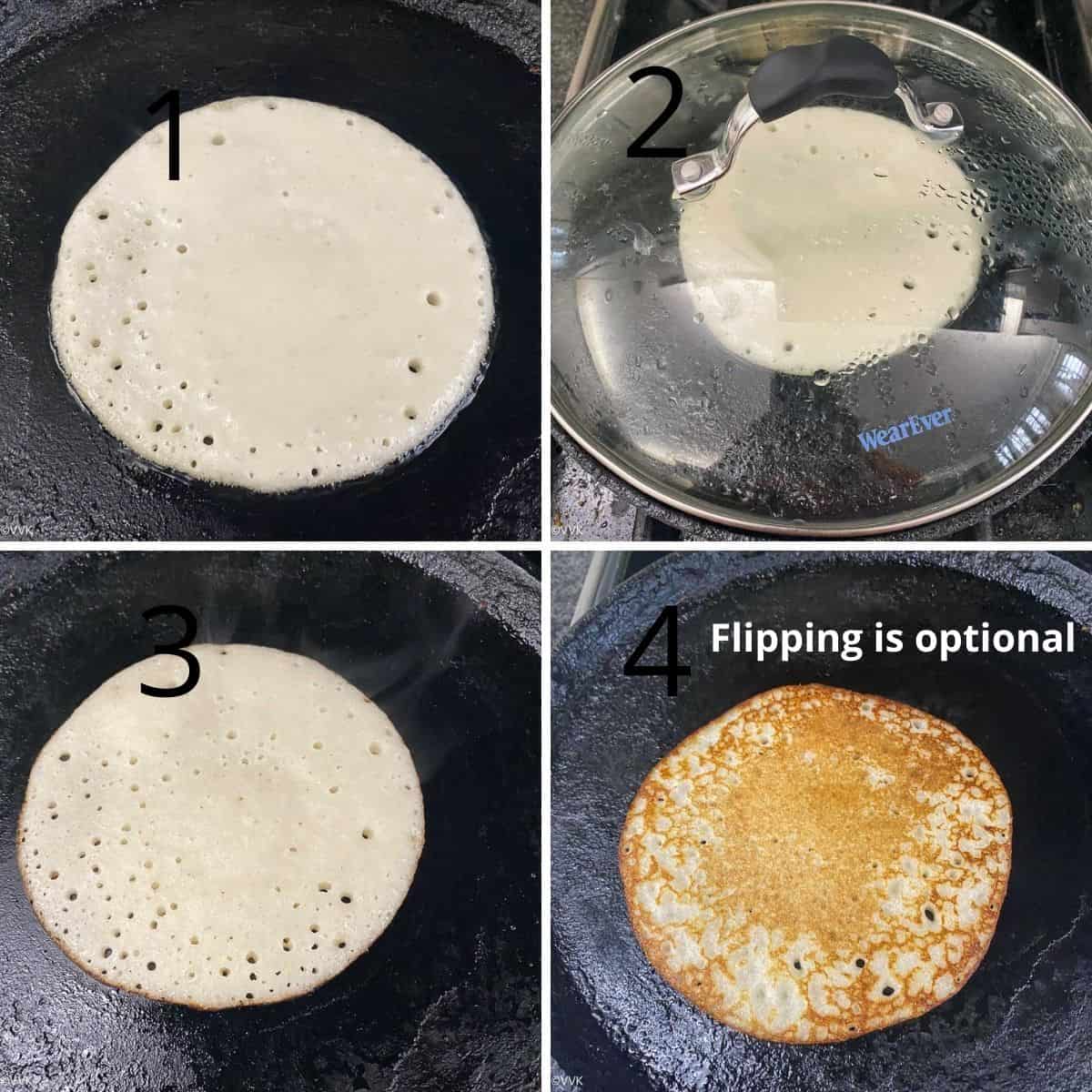 - (Pic 2) Cover it with the lid and let the aval dosa cook in the steam. It usually takes about 50 to 60 seconds. Timing is approx, make sure the top side completely cooked.