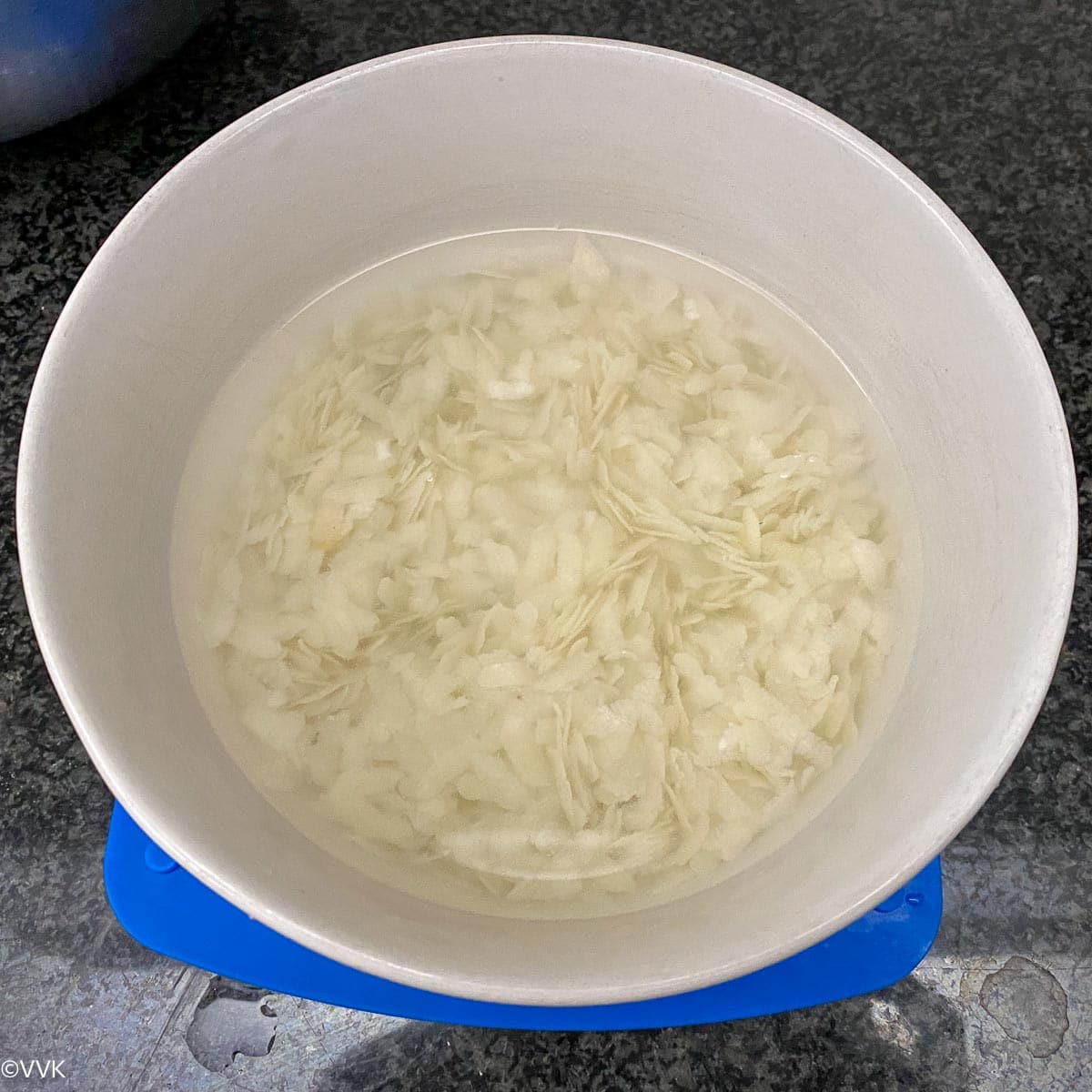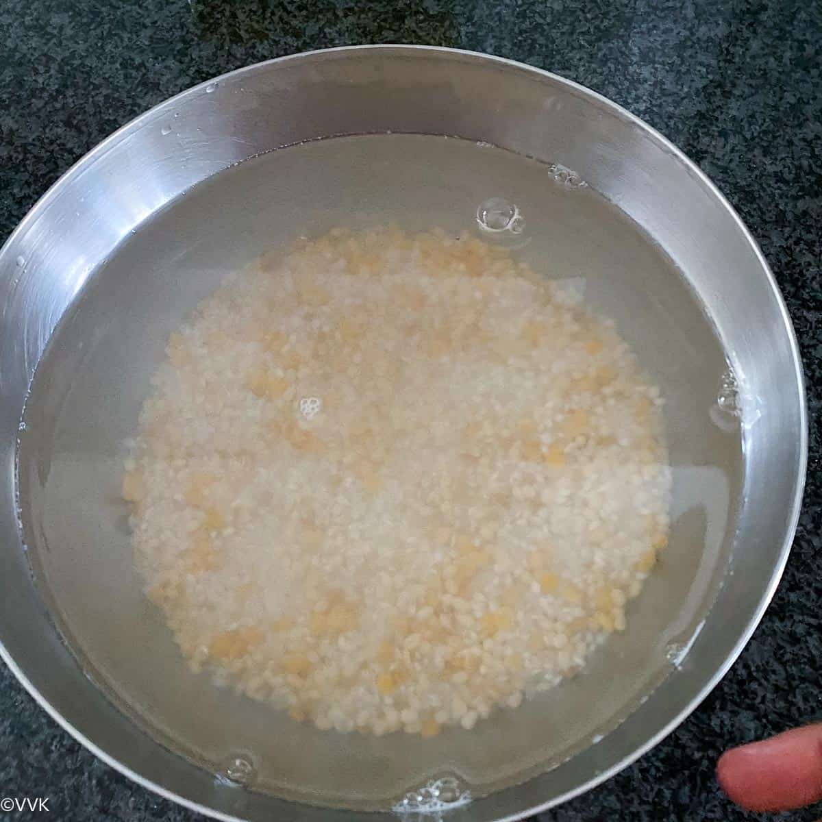 - Wash them together atleast 4 to 5 times until the water runs clear. Now add sufficient water and soak for atleast 5 to 6 hours.
