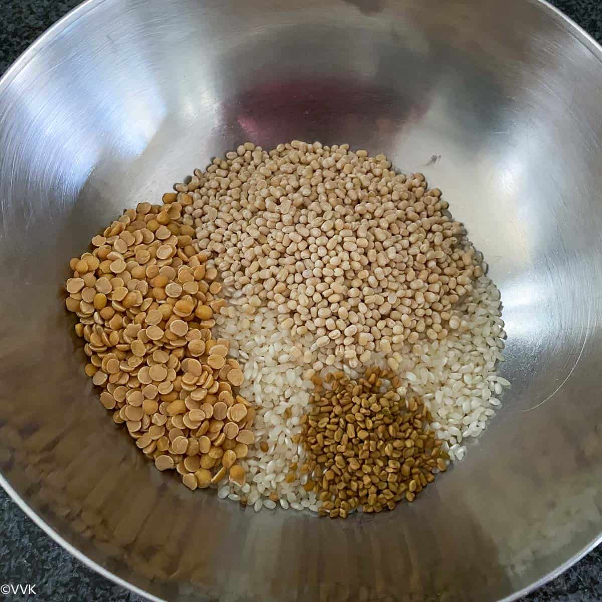 - Take the idli rice, urad dal, fenugreek seeds, and toor dal in a bowl.