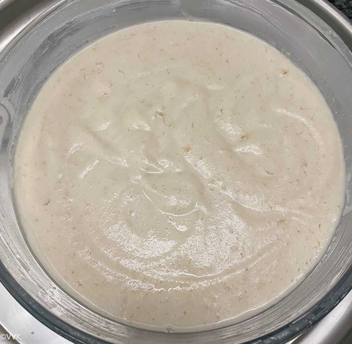 - (Pic 4) Grind into a smooth batter by adding water as required. You might need little extra water for this batch. I added ½ cup + 2 tbsp of water, and you have to mix it in between using a silicone spatula. If not, the batter gets stuck in between the blades. Overall we need 1.5 to 2 cups of water to grind. I used 1.5 cups of water.