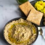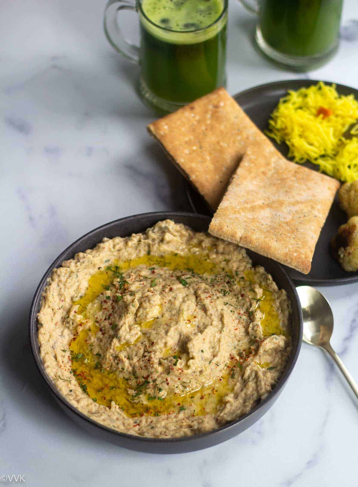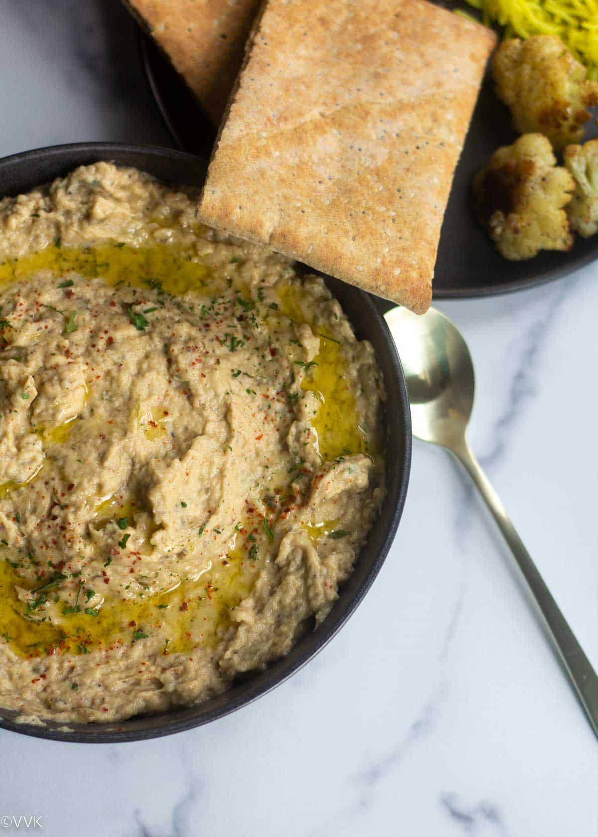 Olive oil: I used olive oil while mixing the roasted eggplant and tahini and added a tbsp before serving.