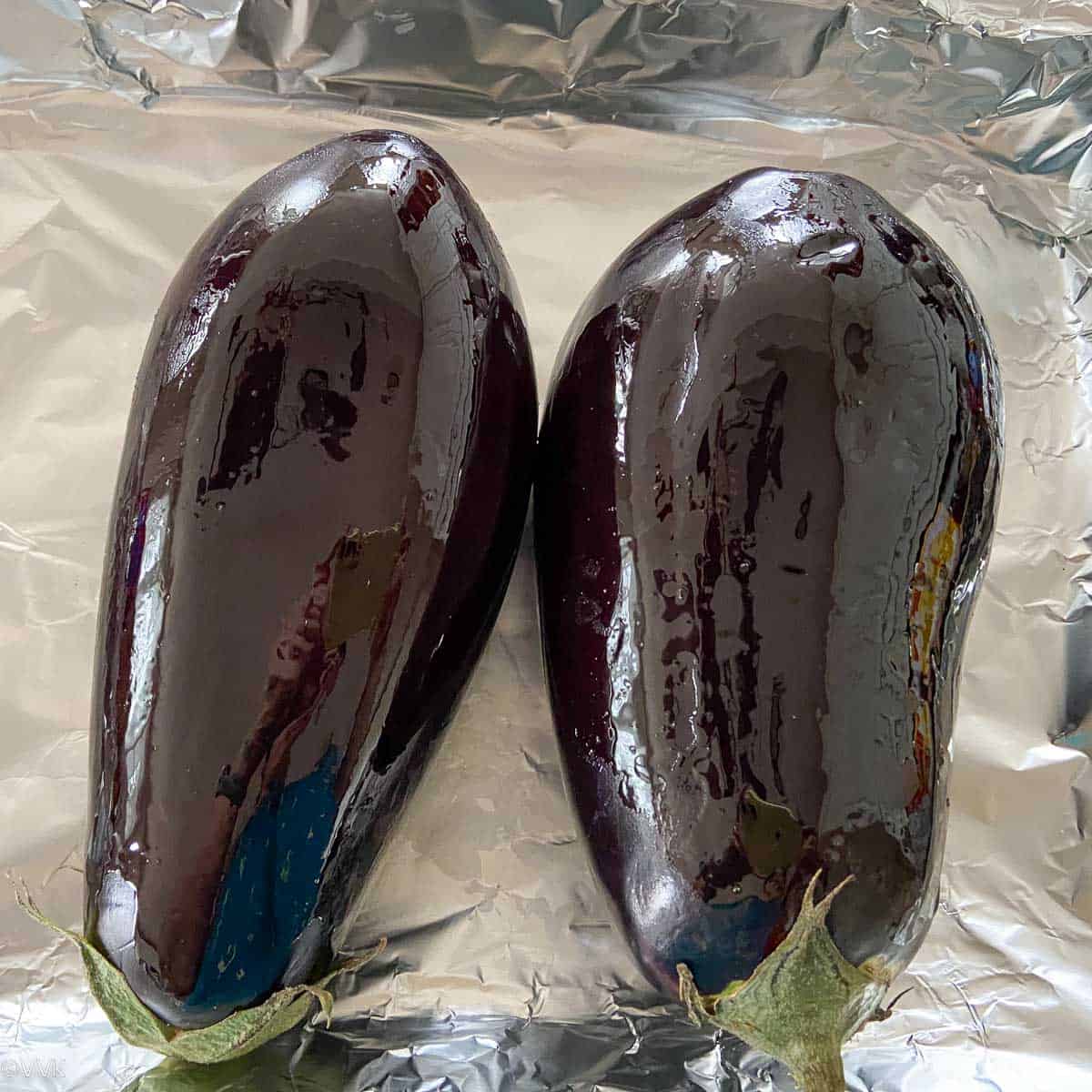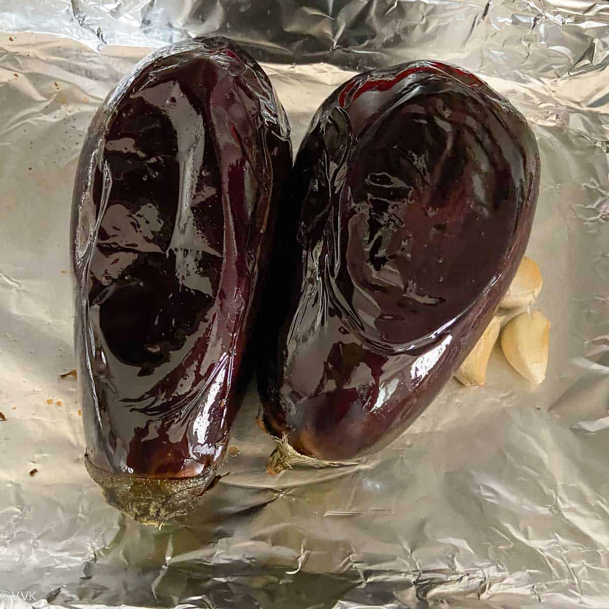 - Preheat the oven to 425deg F. Line the baking tray with aluminum foil or parchment paper and place the two eggplants in the baking tray. Apply oil (½ tbsp atleast) generously on the eggplant and bake for 25 minutes at 425 deg F.