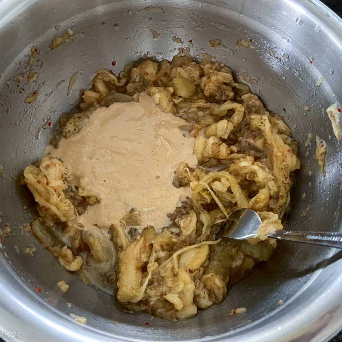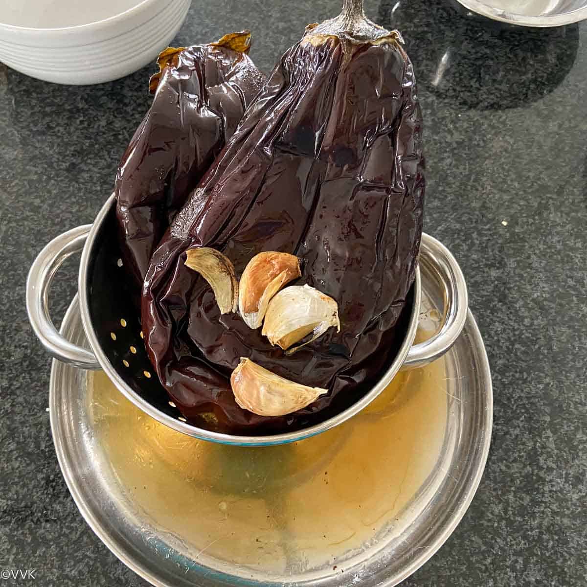 Roasting it on direct fire or grill yields a smoky eggplant dip. But it’s not mandatory. You can bake the eggplants at high temperatures, as I did. Depending upon size of the eggplant, the cooking time might vary. You need to grill/roast or bake the eggplant until it’s soft and tender. The eggplant skin should collapse so that you can peel and break the flesh.