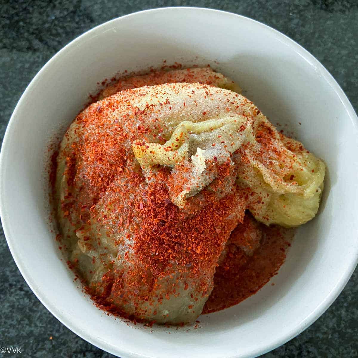 - Once the eggplant has cooled down, gently remove the skin. The skin would come off easily. Similarly, remove the garlic skin and mash it. Transfer the eggplant flesh to a mixing bowl. Add the salt, lemon juice, and Aleppo pepper.