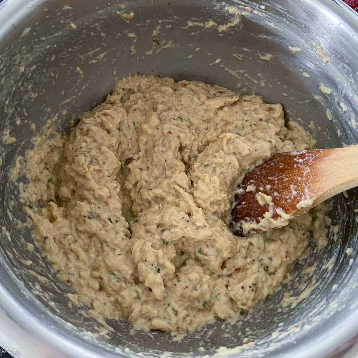 - Using a fork, stir the eggplant vigorously so that all the ingredients blend and the eggplant flesh breaks into strands. Now add the tahini, and using a wooden spoon, mix well until the tahini is well incorporated.
