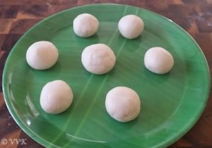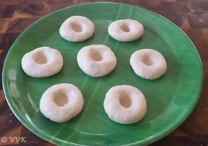 - Flatten this round ball like below. Do not flatten like thattai, more like semi flattened sphere.
