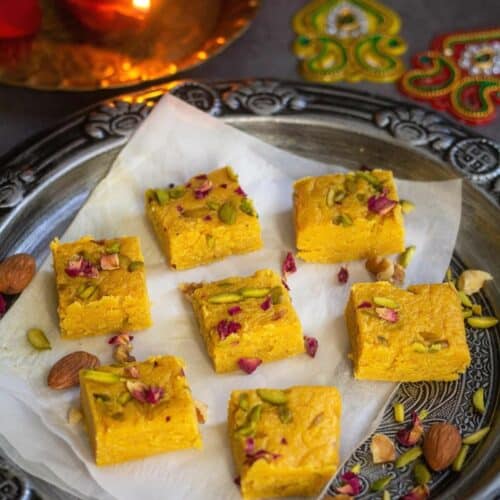 You can serve this dessert warm or cold. This dessert is not fully set like a cake when warm, and it’s more like semi-solid pudding. But if you refrigerate for an hour, the rabri thickens, and you can slice it more like a cake. It tastes delicious, both warm and cold so you can serve it as per your preference.