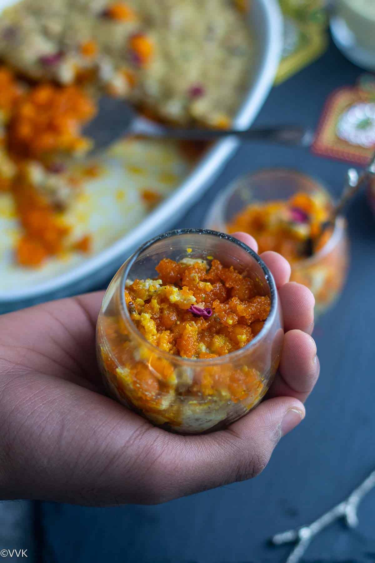You can easily convert this pudding into a dessert jar. After baking this dessert, I mixed the pudding and served this in a dessert jar. Alternatively, you can use oven-safe single-serve dessert glasses or ramekins, layer the boondi and rabri and bake them. You can even top it with gulab jamuns.
