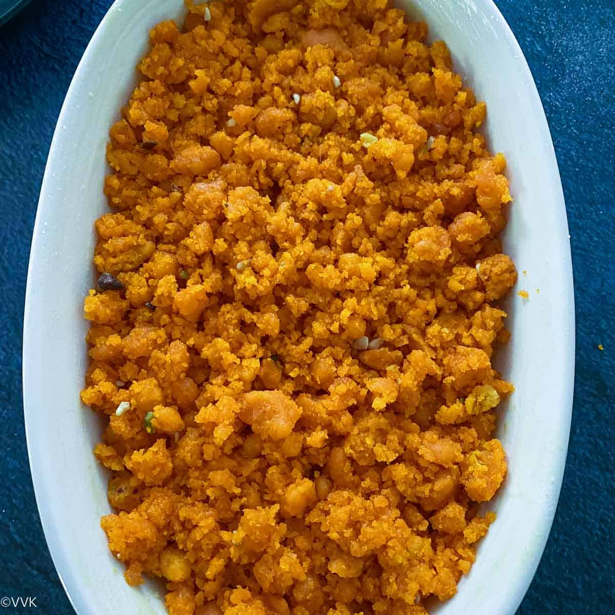 Boondi/motichoor ladoo: You can use sweet boondi, but I went with ladoo and crumbled it. We need 2 cups of crumbled ladoo. The one I used was a mix of sweet boondi ladoo and motichoor ladoo. Ok, the pack said boondi ladoo but it was more like motichoor ladoo. You can use either one or a mix of both.