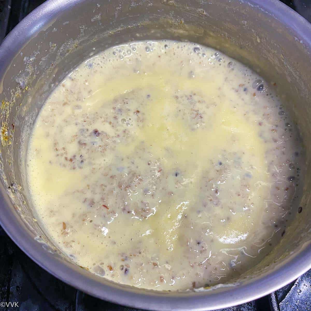- Mix well and cook over medium-low heat for five minutes. Make sure to mix in between, and do not leave it unattended. Turn off the heat and let this instant rabri cool a bit.