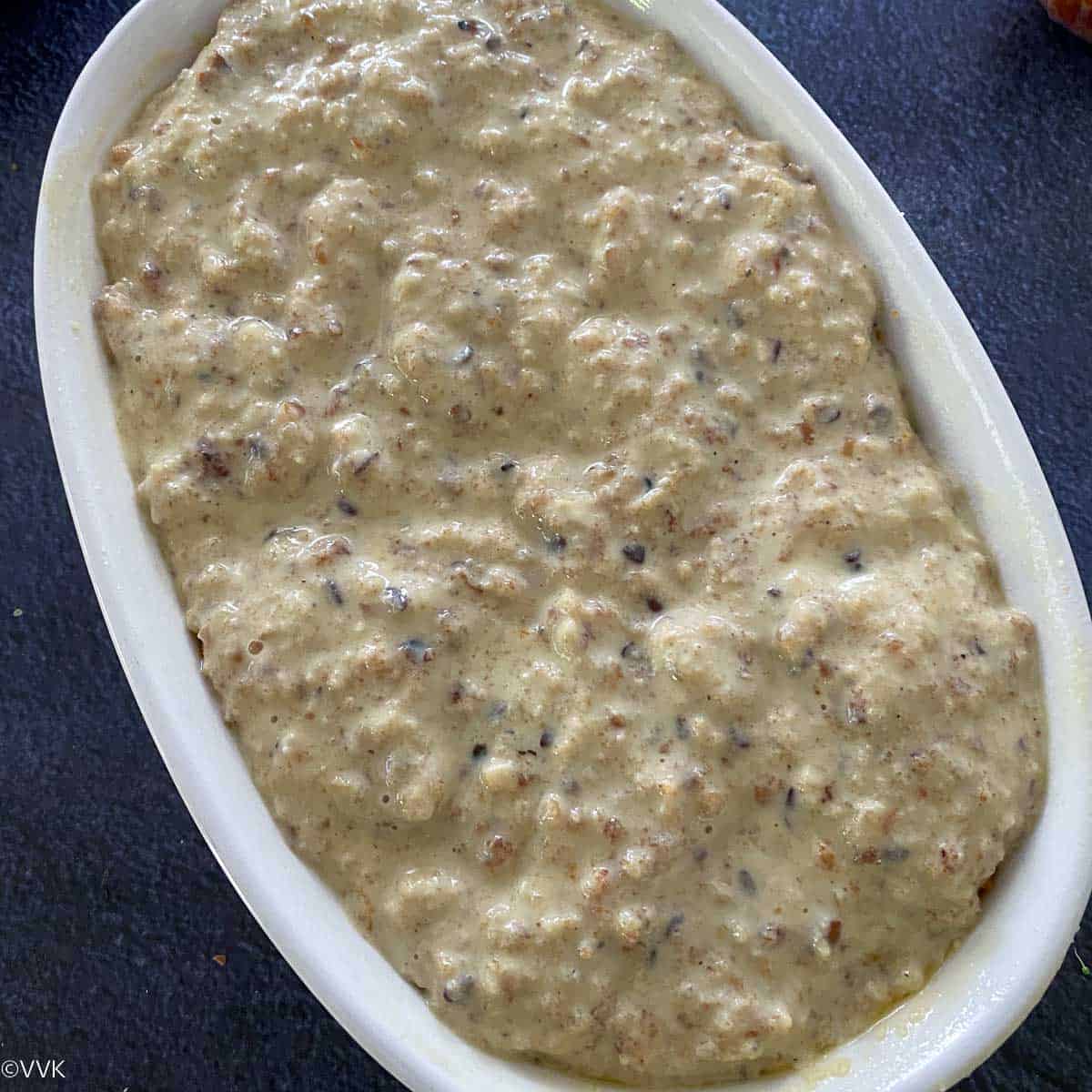 - Grease the tray or bowl where you will bake the pudding with ghee.